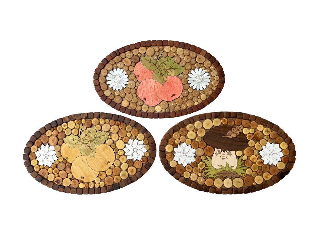 - Design: Oryginalna struktura z widocznymi przekrojami kołeczków drewna oraz estetyczne rysunki w trzech wzorach: truskawka, jabłko, grzybek.